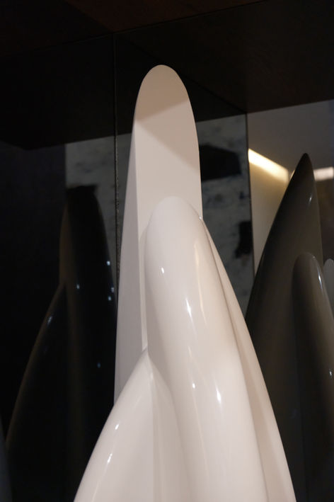 Escultura elaborada a partir de maderas selectas, enriquecida con un recubrimiento técnico de alto desempeño que imprime ligereza y solidez al conjunto. Su superficie, finalizada con un resplandeciente tono blanco brillante, ha sido cuidadosamente pulida para evocar pureza y refinamiento.